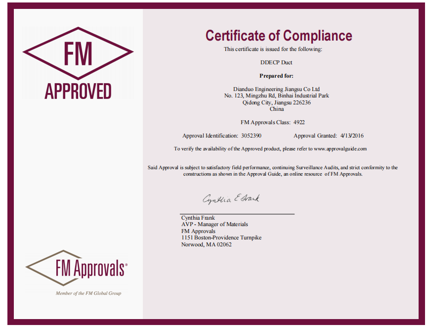 不锈钢内衬特氟龙风管系列产品正式通过美国FM认证,属中国大陆首家